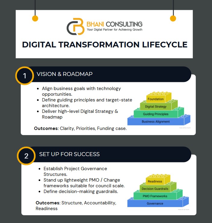 At Bhani Consulting, our Digital Transformation Lifecycle is designed to guide organisations through every stage of their transformation journey — from discovery to sustained success. We take a holistic, business-first approach that ensures technology investments deliver measurable value.
